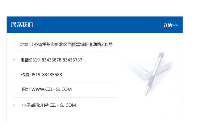 地址:常州市新北區友邦商務大廈1幢16、17層  電話:0519-85101652  傳真:0519-85112595  郵編:213022  網址:www_cz-jiayue_cn.spaqpx.com  郵箱:xiajifengaa@163.com